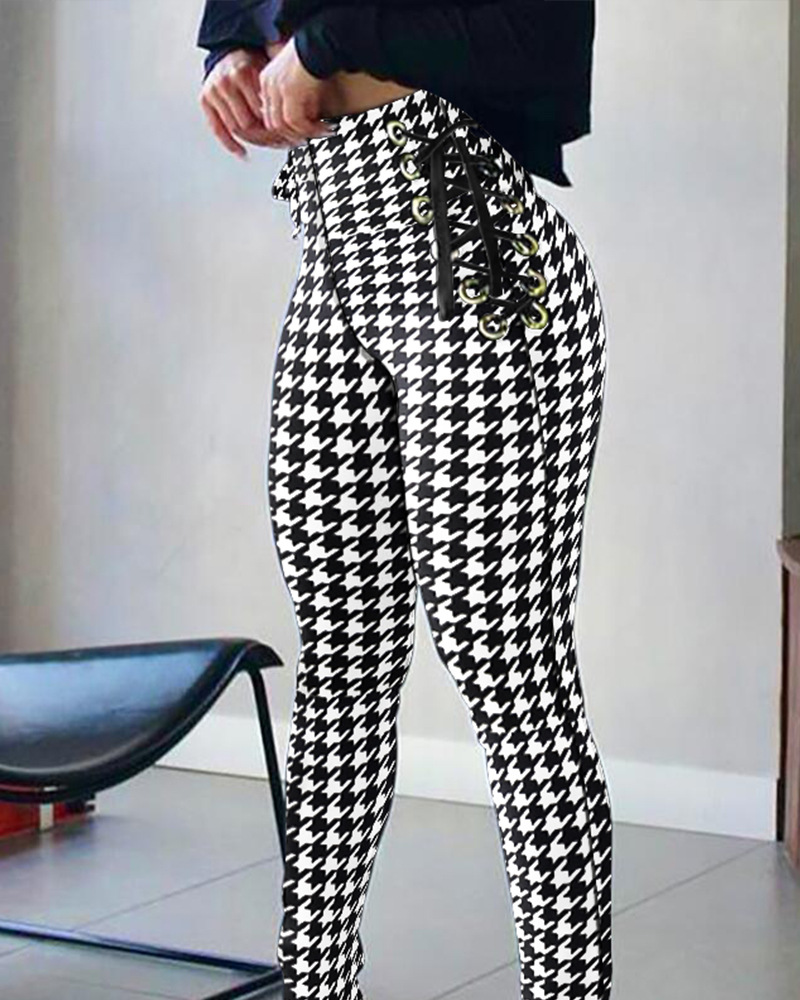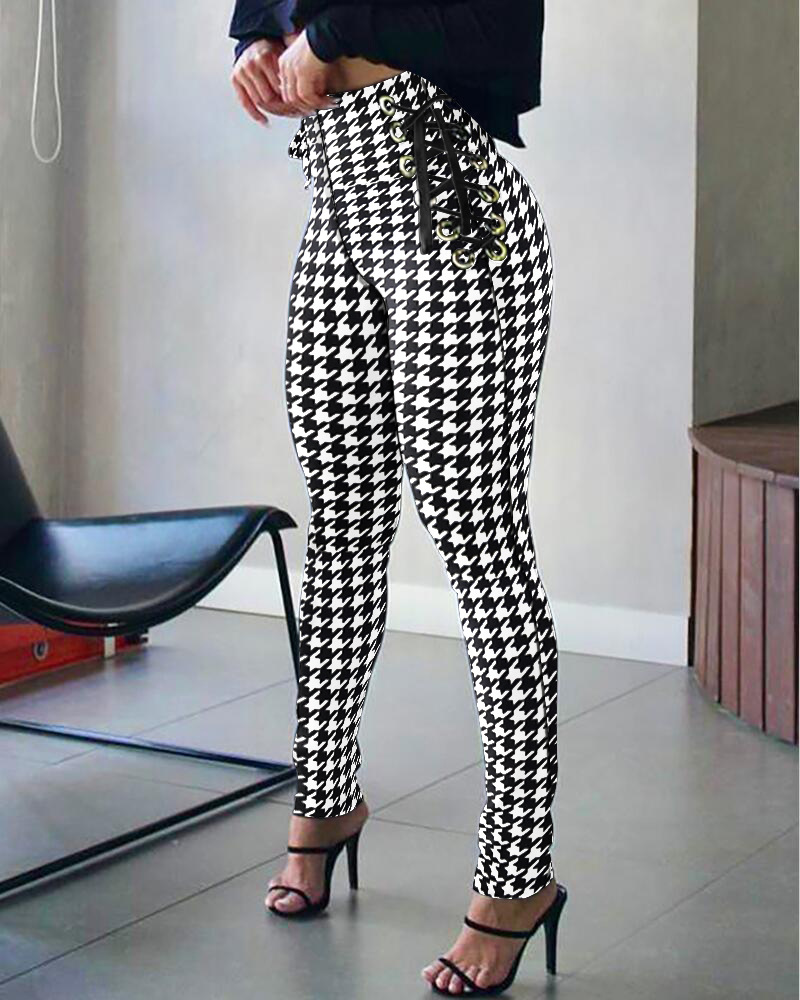 Women's Houndstooth Waist Side Eyelet Tights Leggings